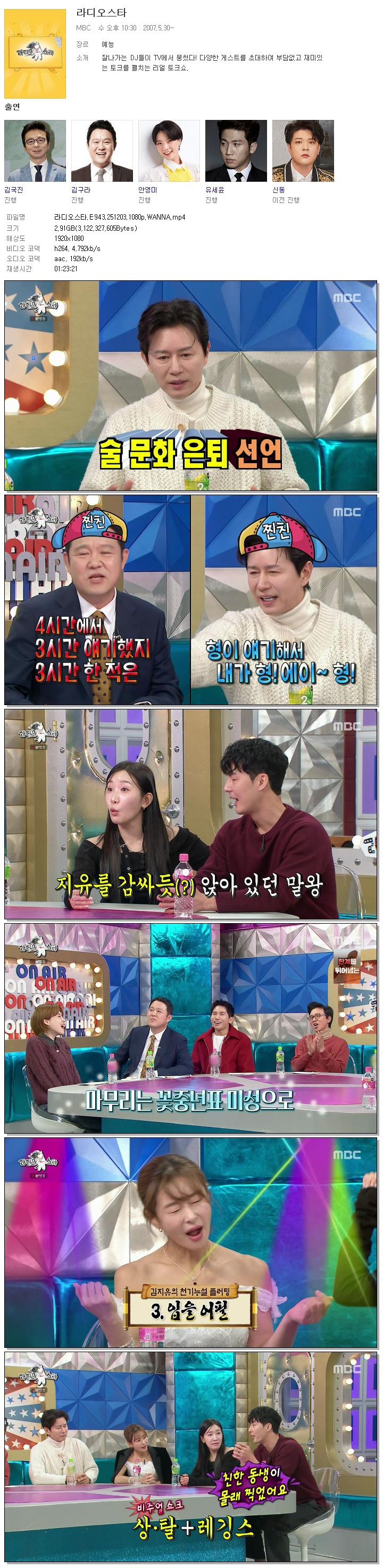 | [MBC] 라디오스타.E943.251203.1080p.WANNA[김민종, 예지원].mp4 | 2.9 G | 01:23:21 | 1920x1080 |