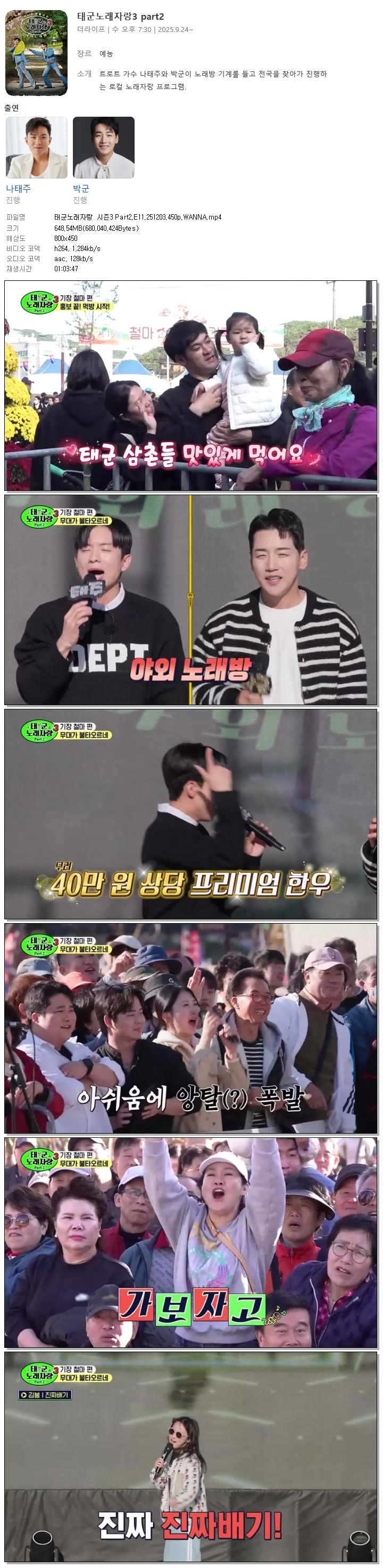 [더라이프] 태군노래자랑 시즌3 Part2.E11.251203.450p.WANNA[나태주, 박군].mp4 648.5 M 01:03:47 800x450