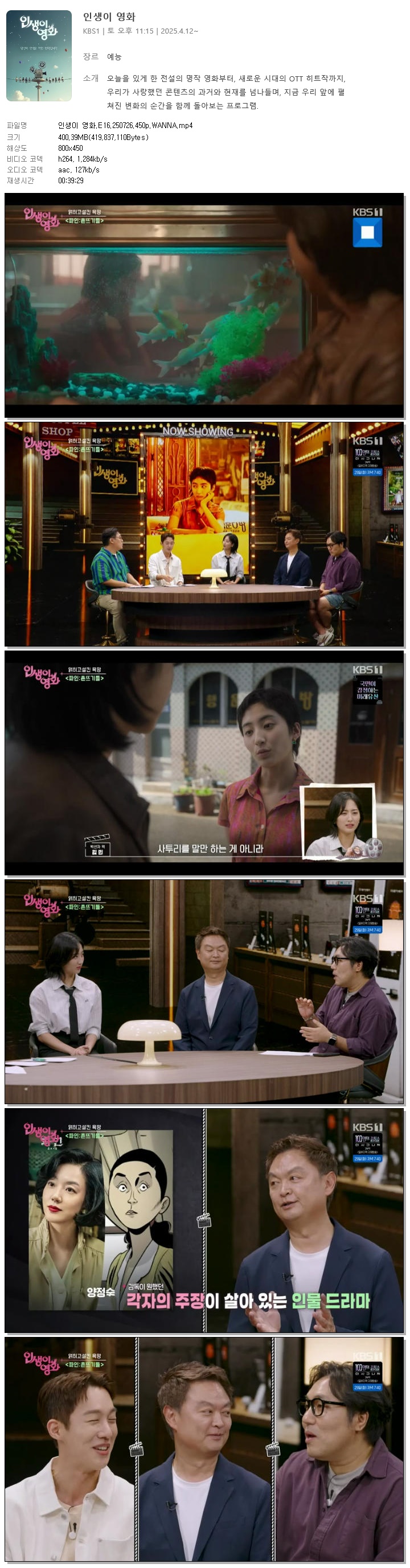 [KBS1] 인생이 영화.E16.250726.450p.WANNA.mp4 400.4 M 00:39:29 800x450