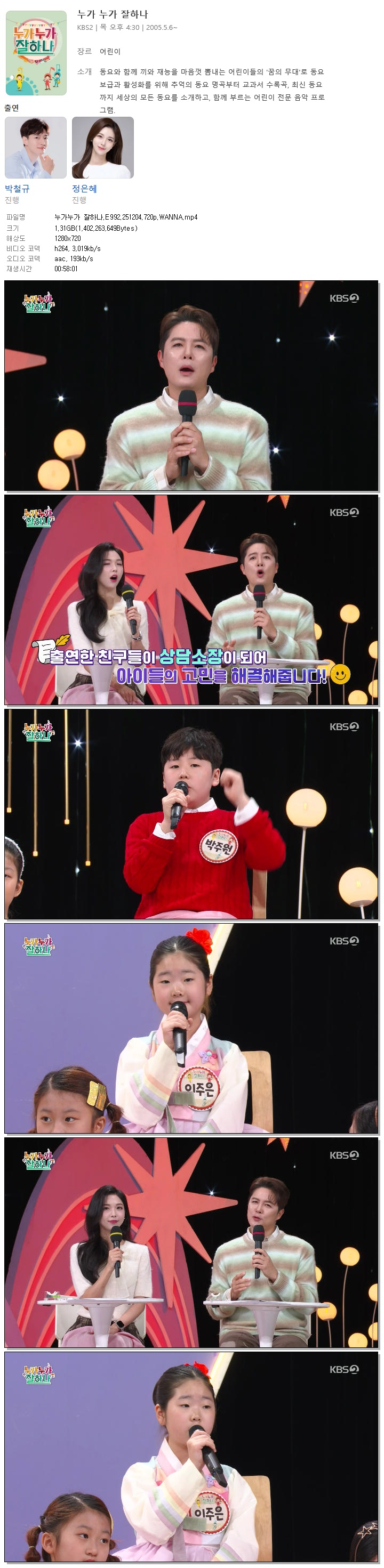 | [KBS2] 누가누가 잘하나.E992.251204.720p.WANNA[박철규, 정은혜].mp4 | 1.3 G | 00:58:01 | 1280x720 |