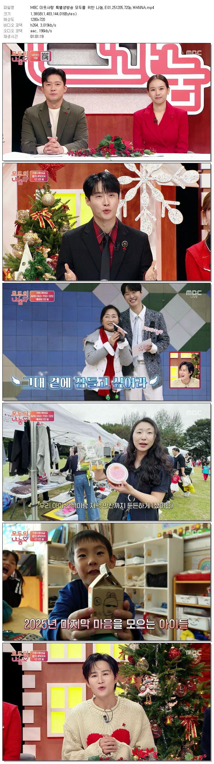 | [MBC] MBC 이웃사랑 특별생방송 모두를 위한 나눔.E01.251205.720p.WANNA.mp4 | 1.4 G | 01:01:19 | 1280x720 |