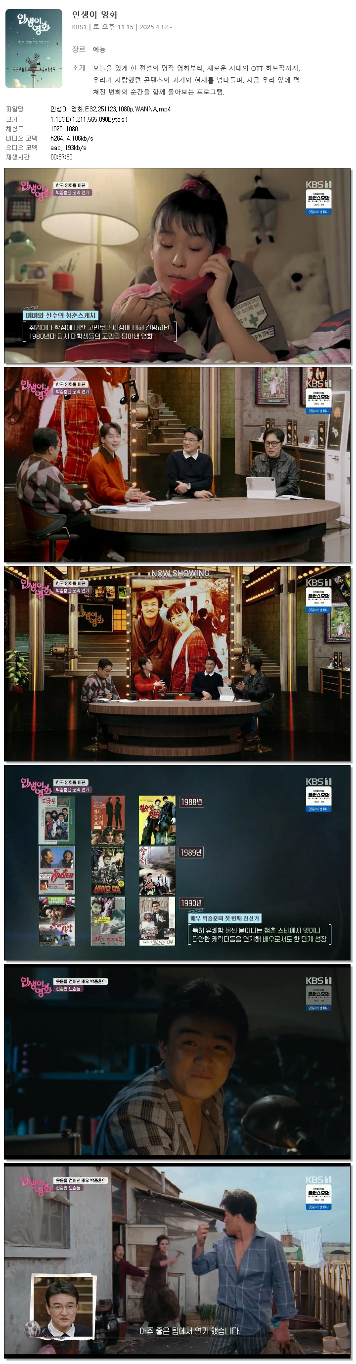 | [KBS1] 인생이 영화.E32.251123.1080p.WANNA.mp4 | 1.1 G | 00:37:30 | 1920x1080 |