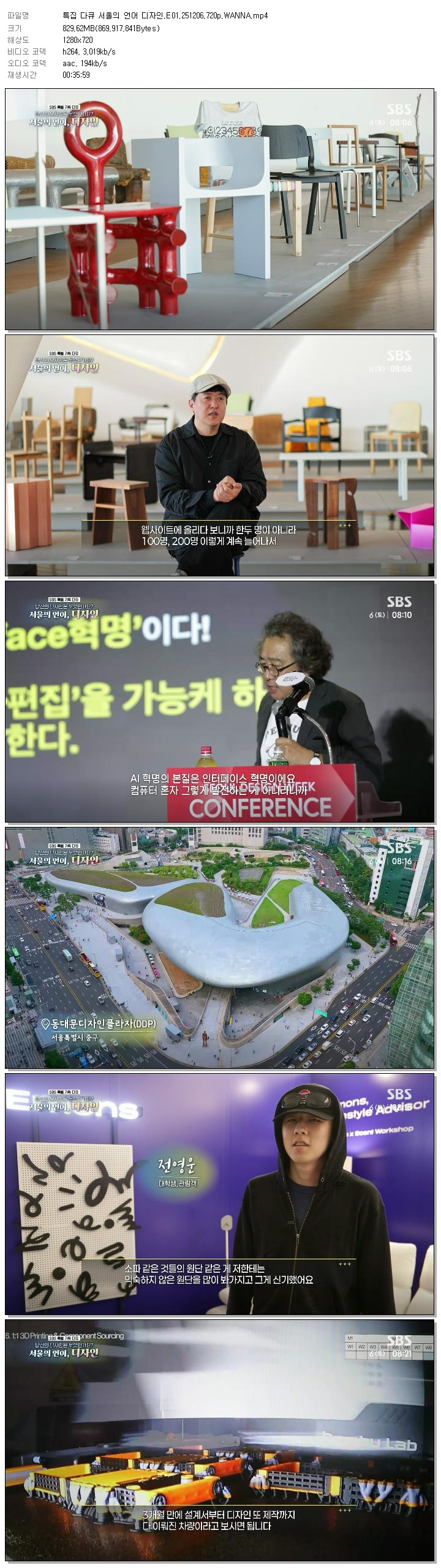| [SBS] 특집 다큐 서울의 언어 디자인.E01.251206.720p.WANNA.mp4 | 829.6 M | 00:35:59 | 1280x720 |