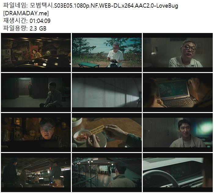 | 모범택시.S03E05.1080p.NF.WEB-DL.x264.AAC2.0-LoveBug [DRAMADAY.me].mkv | 2.3 G | - | 1920x1080 |