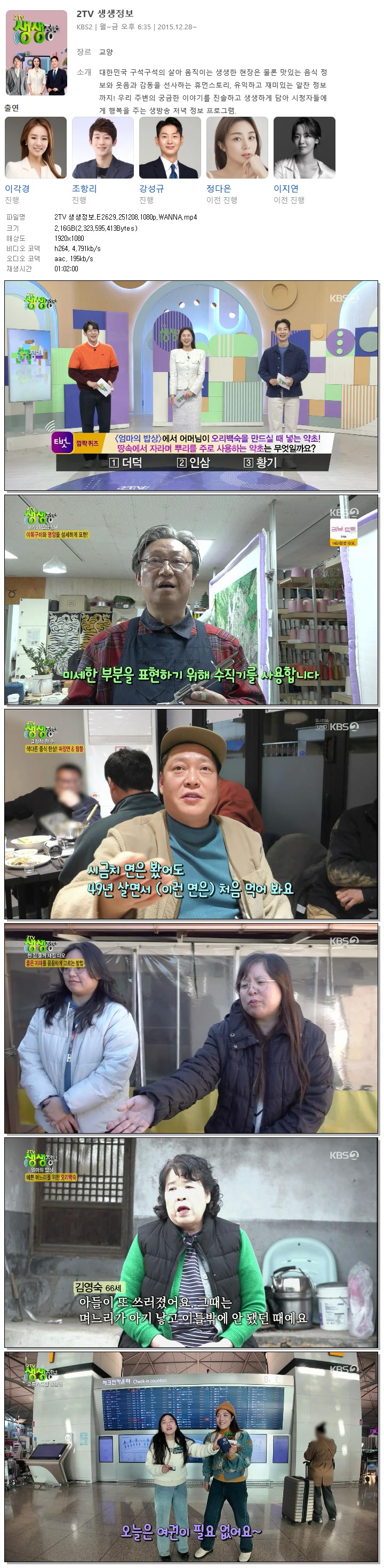 | [KBS2] 2TV 생생정보.E2629.251208.1080p.WANNA[이각경, 조항리].mp4 | 2.2 G | 01:02:00 | 1920x1080 |