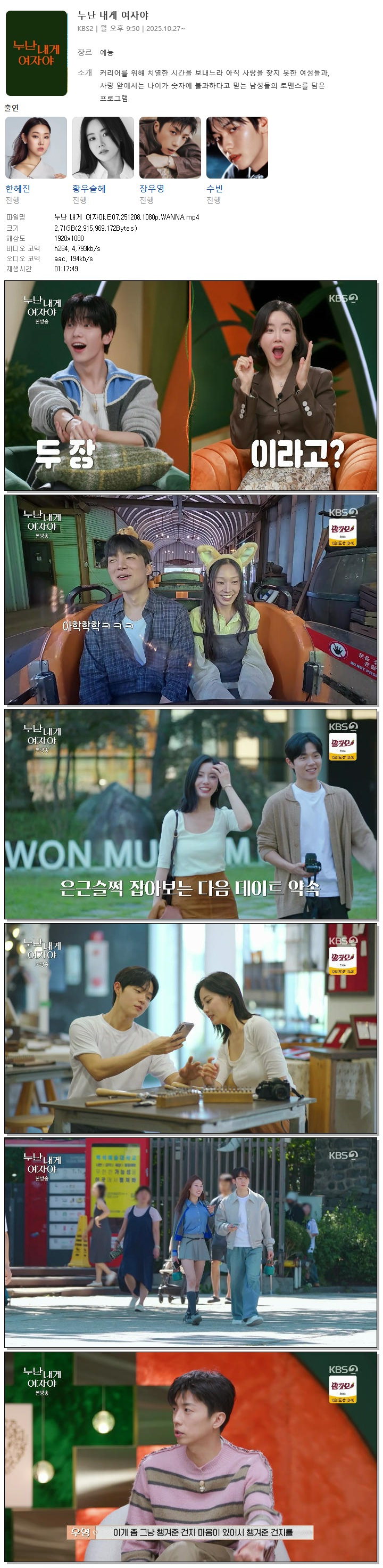 | [KBS2] 누난 내게 여자야.E07.251208.1080p.WANNA[한혜진, 황우슬혜].mp4 | 2.7 G | 01:17:49 | 1920x1080 |