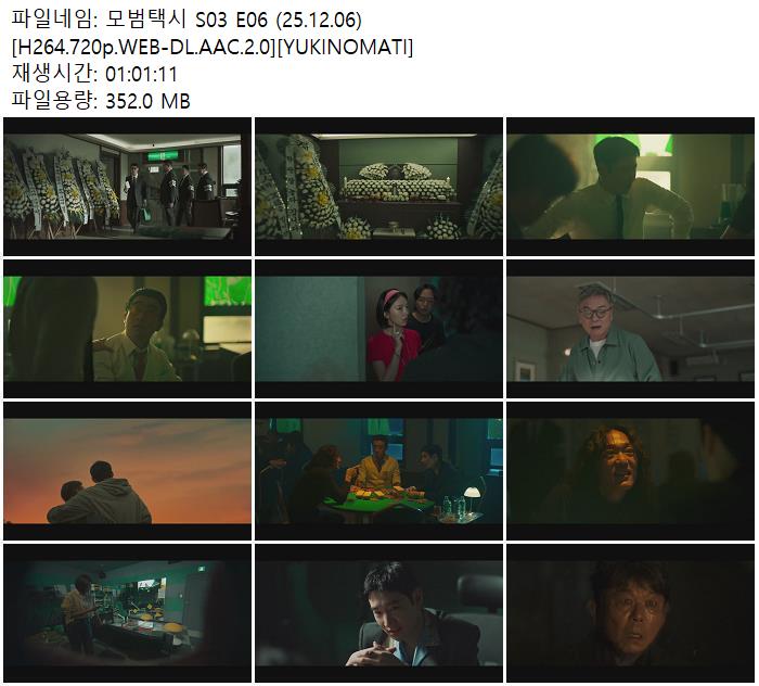 | 모범택시 S03 E06 (25.12.06) [H264.720p.WEB-DL.AAC.2.0][YUKINOMATI].mkv | 352 M | - | 1280x720 |