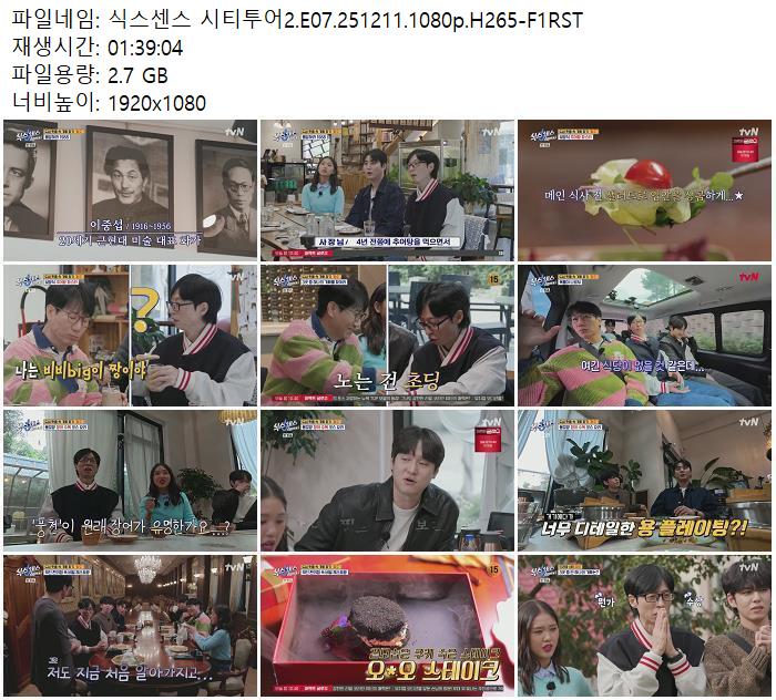 | 식스센스 시티투어2.E07.251211.1080p.H265-F1RST.mp4 | 2.7 G | - | 1920x1080 |