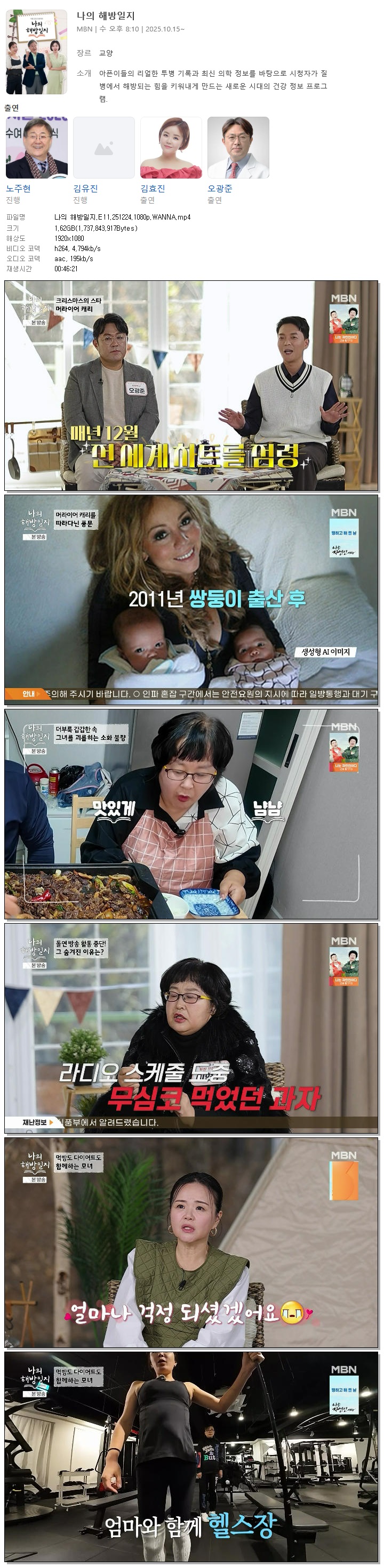 | [MBN] 나의 해방일지.E11.251224.1080p.WANNA[노주현, 김효진].mp4 | 1.6 G | 00:46:21 | 1920x1080 |