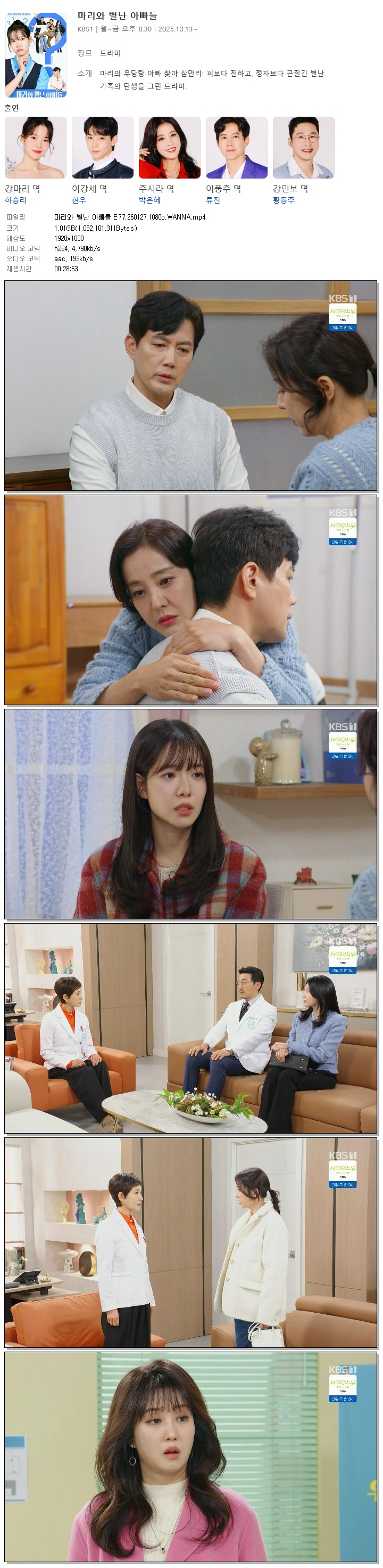 | [KBS1] 마리와 별난 아빠들.E77.260127.1080p.WANNA[하승리, 현우].mp4 | 1 G | 00:28:53 | 1920x1080 |