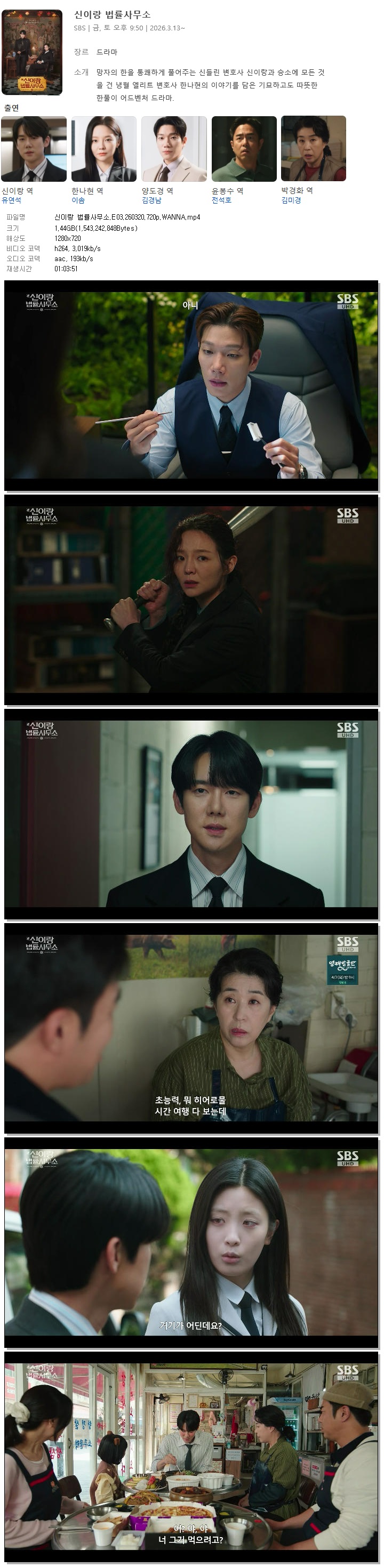 | [SBS] 신이랑 법률사무소.E03.260320.720p.WANNA[유연석, 이솜].mp4 | 1.4 G | 01:03:51 | 1280x720 |