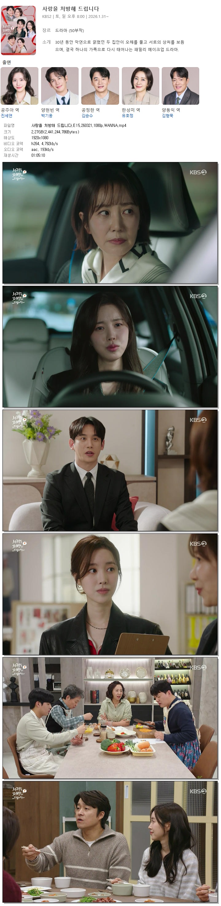 | [KBS2] 사랑을 처방해 드립니다.E15.260321.1080p.WANNA[진세연, 박기웅].mp4 | 2.3 G | 01:05:10 | 1920x1080 |