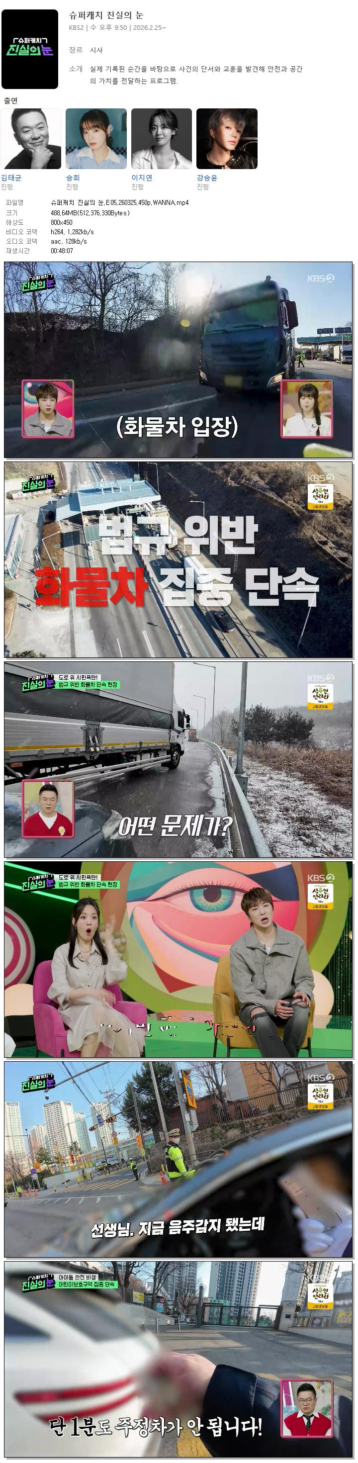 | [KBS2] 슈퍼캐치 진실의 눈.E05.260325.450p.WANNA[김태균, 승희].mp4 | 488.6 M | 00:48:07 | 800x450 |