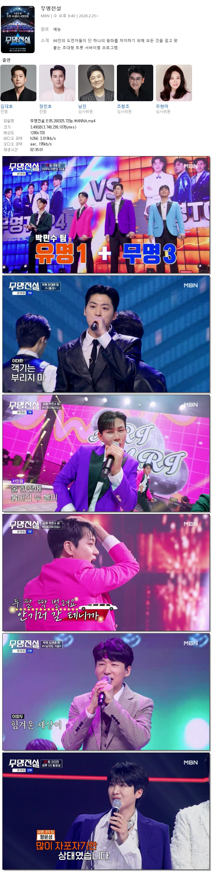 | [MBN] 무명전설.E05.260325.720p.WANNA[김대호, 장민호].mp4 | 3.5 G | 02:35:01 | 1280x720 |