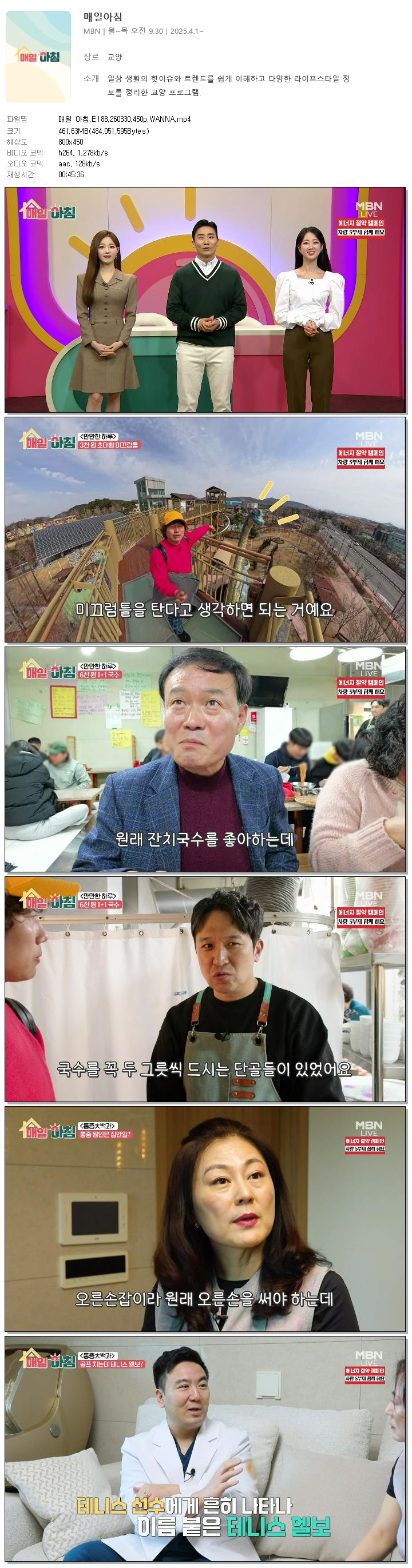 | [MBN] 매일 아침.E188.260330.450p.WANNA[한혜원, 이정수].mp4 | 461.6 M | 00:45:36 | 800x450 |