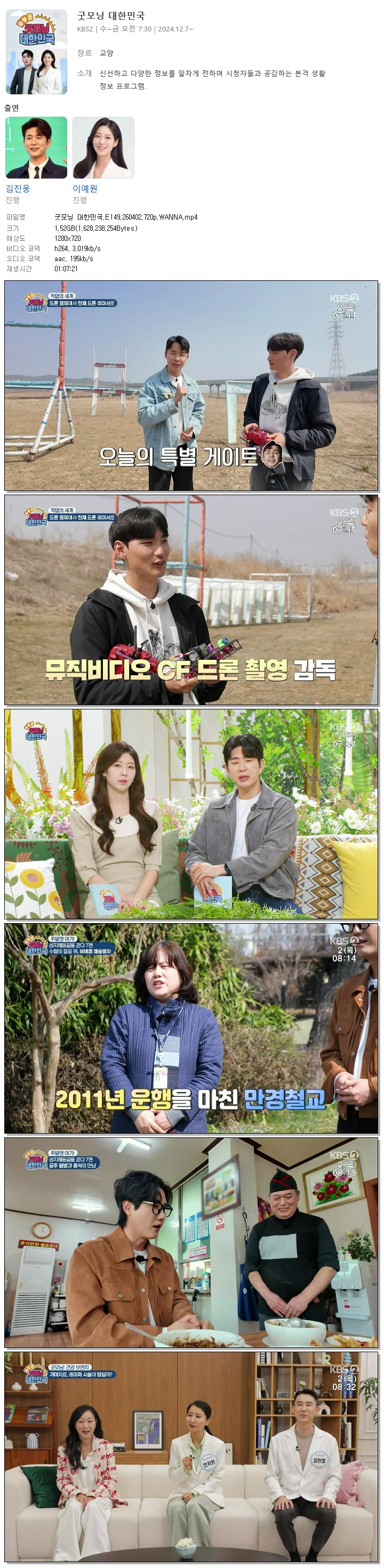 | [KBS2] 굿모닝 대한민국.E149.260402.720p.WANNA[김진웅, 이예원].mp4 | 1.5 G | 01:07:21 | 1280x720 |