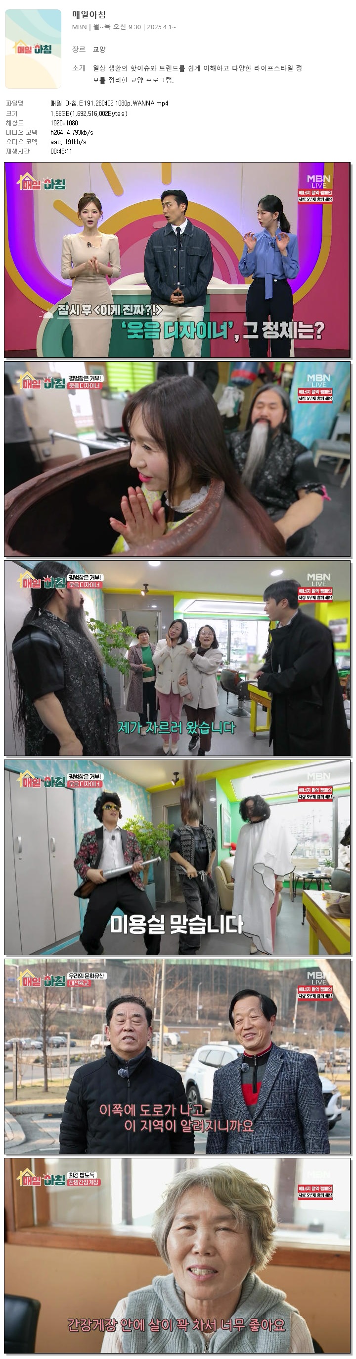 [MBN] 매일 아침.E191.260402.1080p.WANNA[한혜원, 이정수].mp4 1.6 G 00:45:11 1920x1080