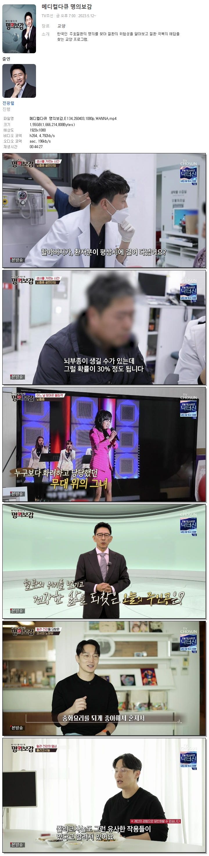 | [TV조선] 메디컬다큐 명의보감.E134.260403.1080p.WANNA[전광렬].mp4 | 1.6 G | 00:44:27 | 1920x1080 |