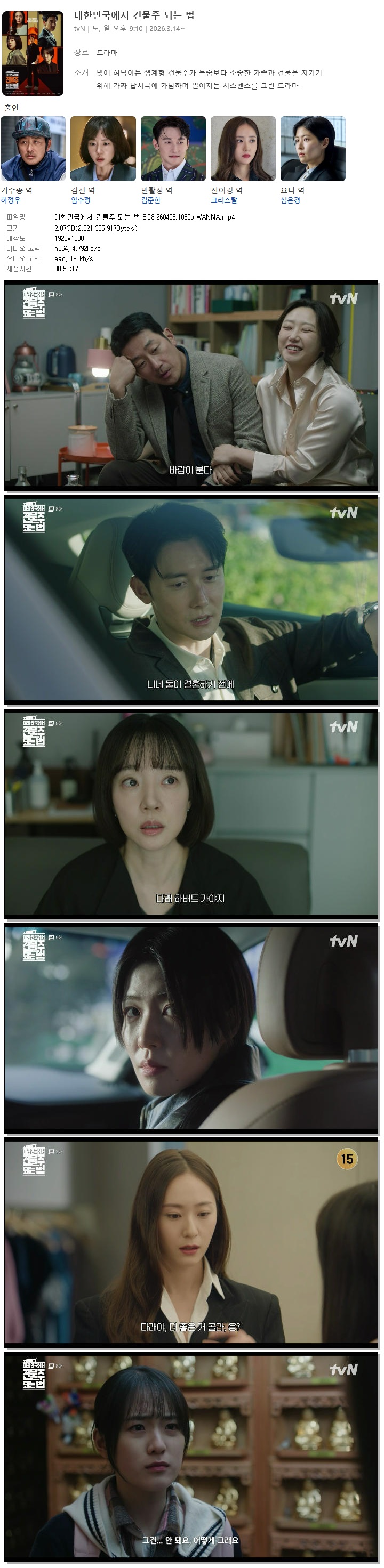 | [TVN] 대한민국에서 건물주 되는 법.E08.260405.1080p.WANNA[하정우, 임수정].mp4 | 2.1 G | 00:59:17 | 1920x1080 |