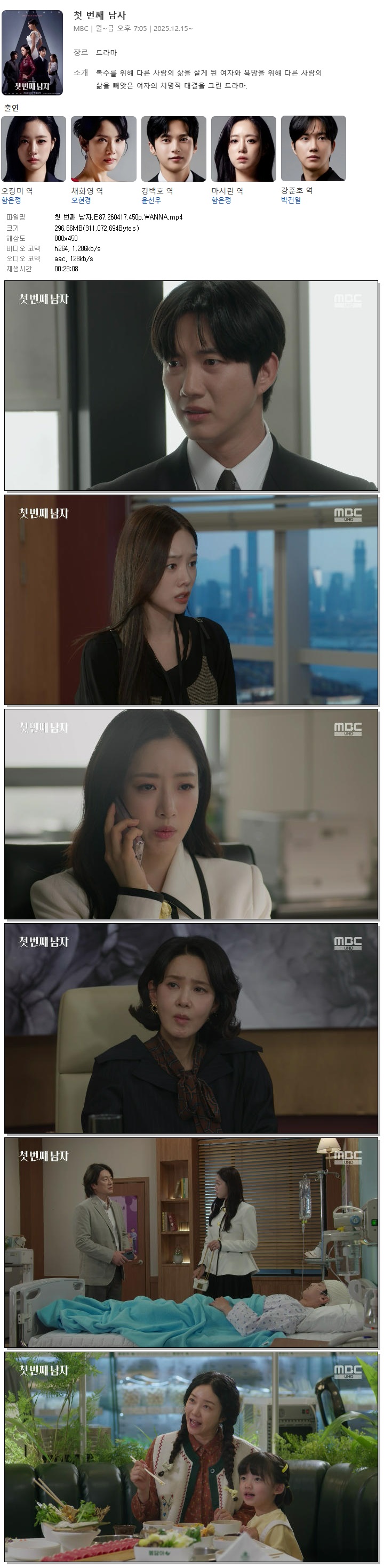 | [MBC] 첫 번째 남자.E87.260417.450p.WANNA[함은정, 오현경].mp4 | 296.7 M | 00:29:08 | 800x450 |