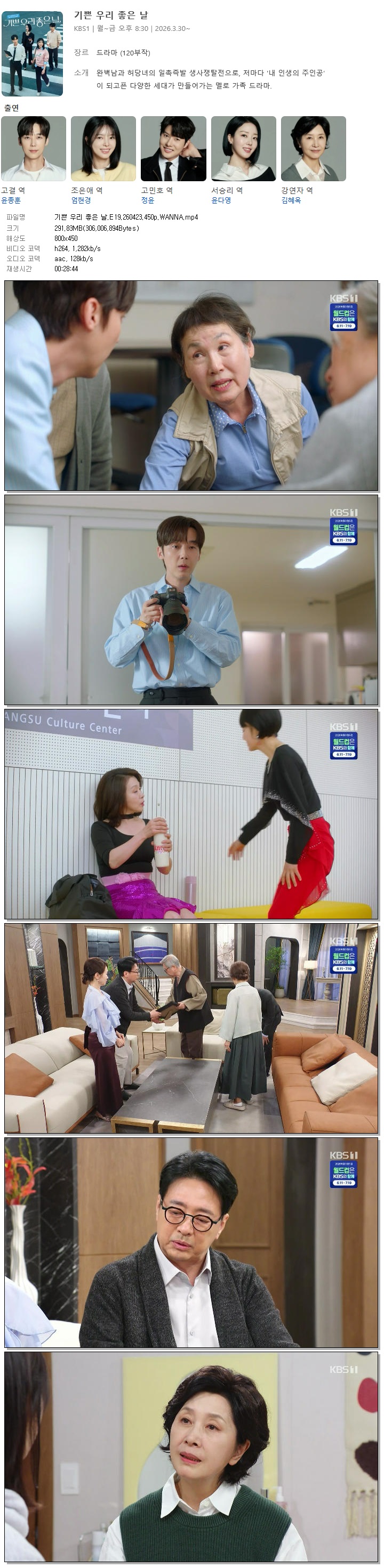 | [KBS1] 기쁜 우리 좋은 날.E19.260423.450p.WANNA[윤종훈, 엄현경].mp4 | 291.8 M | 00:28:44 | 800x450 |