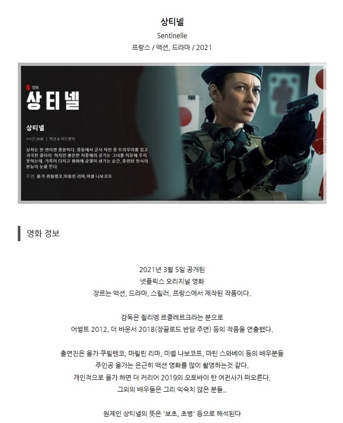 | -액션-- 상티넬 - FHD 자체한글_01.mkv | 3.1 G | - | 1920x1080 |