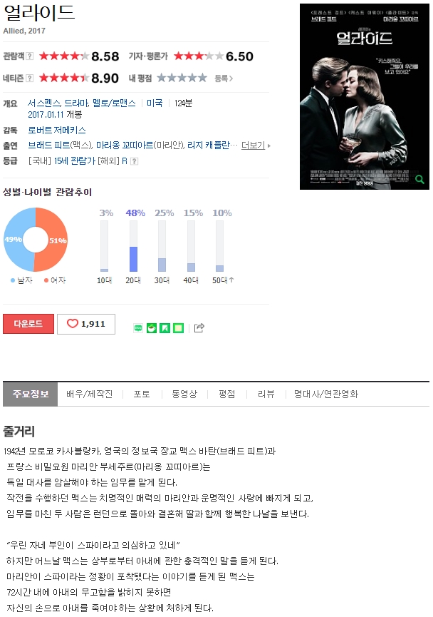 -로맨스 멜로--얼라이드- 2016 1080p 자체자막_1.mp4 | 3.2 G | 02:04:35 | 1920x1080 |
