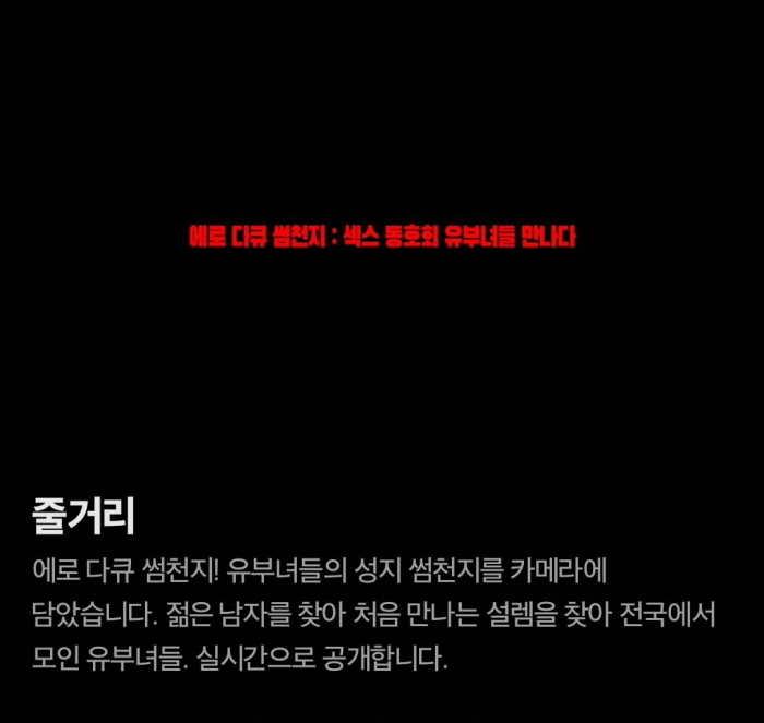 | 에로다큐 썸천지 섹스동호회 유부녀들 만나다.mkv | 3.9 G | 00:53:00 | 1728x1080 |