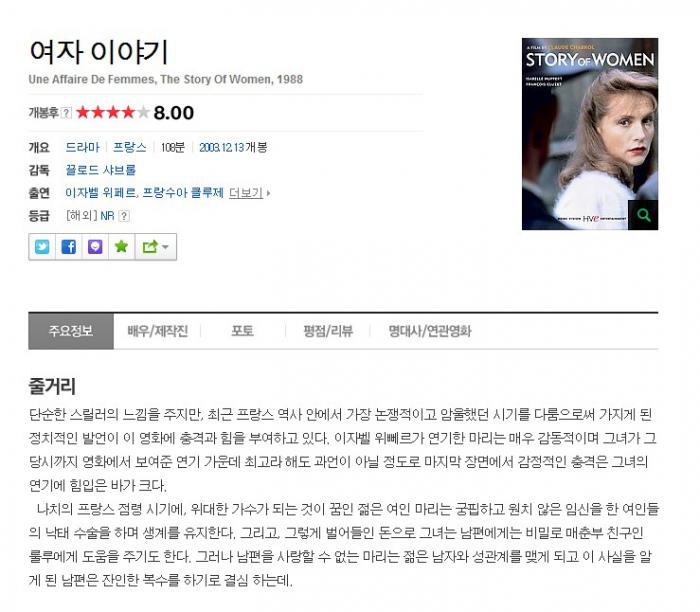 | Une Affaire De Femmes[여자이야기].avi | 700.1 M | 01:43:00 | 800X484 |