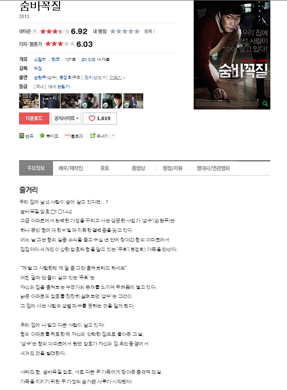 | 숨바꼭질.mkv | 2.7 G | 01:47:24 | 1280X720 |
