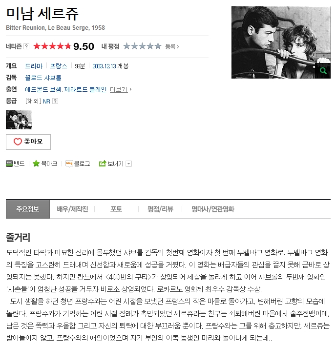 | 미남 세르쥬.Bitter Reunion, Le Beau Serge.1958.1080p.BluRay.x264-CiNEFiLE.mkv | 6.6 G | 01:39:00 | 1920x1080 |