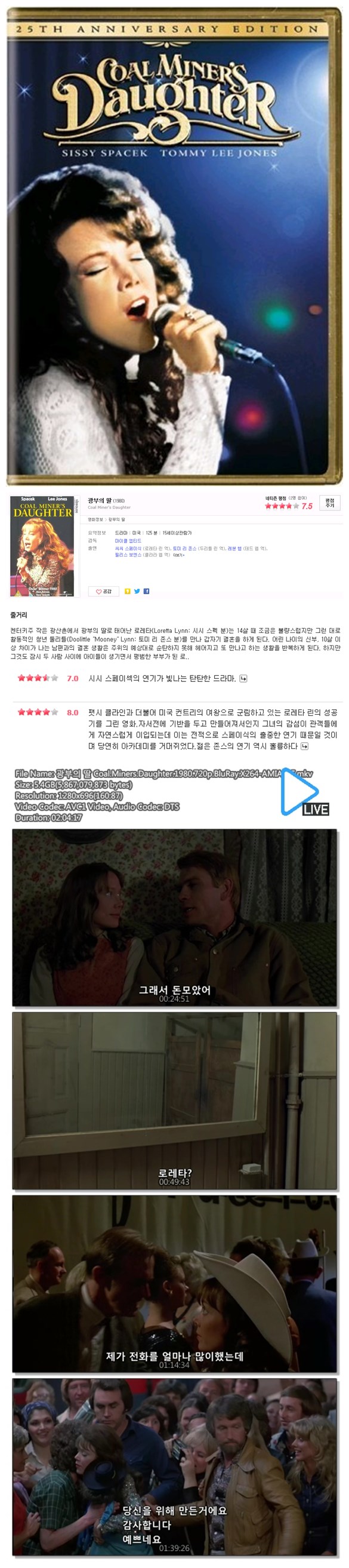 | 광부의 딸 Coal.Miners.Daughter.1980.720p.BluRay.X264-AMIABLE.mkv | 5.5 G | 02:04:17 | 1280x720 |