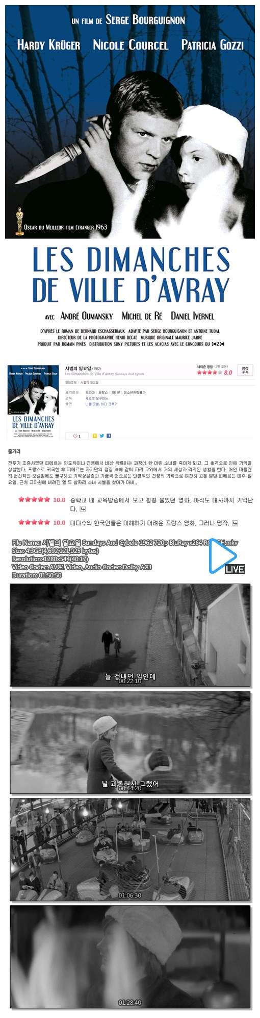 | 시벨의 일요일 Sundays And Cybele 1962 720p BluRay x264 ROUGH.mkv | 4.4 G | 01:50:50 | 1280x720 |