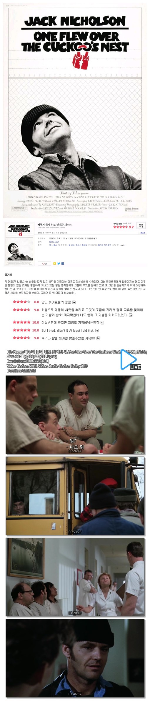 뻐꾸기 둥지 위로 날아간 새.One Flew Over The Cuckoos Nest.1975.720p.BluRay.x264-SiNNERS.mkv 4.4 G 02:13:00 1280x720