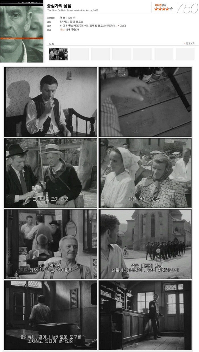 | 중심가의상점 감독: 얀 카다, 엘마 크로스 주연: 이다 카민스카, 조제프 크로너 때는 제2차 세계대전. 체코의 작은 마을에도 나치의 마수는 어김없이 드리워지고, 유대인의 상업행위에도 제동이 걸립니다. 이로 인해 가난하고 어수룩한 소작농 토노에게 귀가 들리지 않는 노년의 유대인 과부 로잘리가 운영하는 단추 가게를 가로챌 기회가 찾아오죠. 동서가 기관원인 든든한 빽을 둔 덕에 공짜로 가게를 차지하게 된 토노와 졸지에 피고용인 신분이 되어버린 로잘리의 사이가 좋지 않은 건 너무도 당연한 일. 하지만 매일같이 투닥거리는 와중에도 토노는 로 |