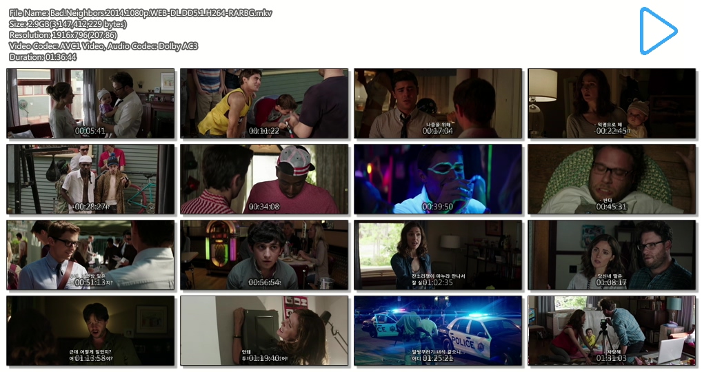 | Bad.Neighbors.2014.1080p.WEB-DL.DD5.1.H264-RARBG.mkv | 2.9 G | 01:36:00 | 1920x1080 |