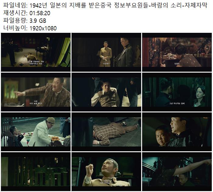 | ★[ 바 람 의 소 리 ] 1942년 일본의 지배를 받은중국 정보부요원들 자체자막_1.mp4 | 3.9 G | 01:58:20 | 1920x1080 |