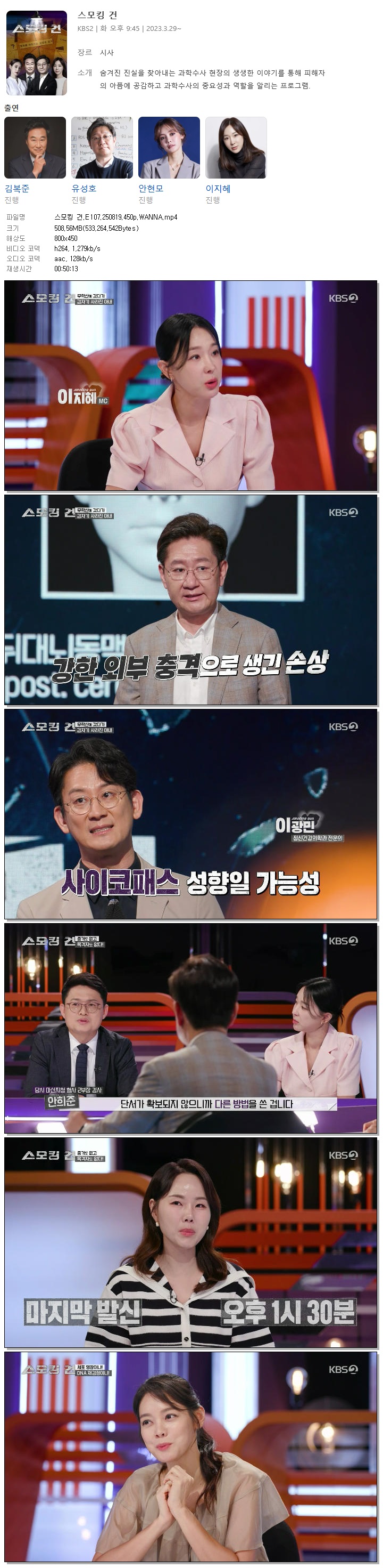 | [KBS2] 스모킹 건.E107.250819.450p.WANNA[김복준, 안현모].mp4 | 508.6 M | 00:50:13 | 800x450 |