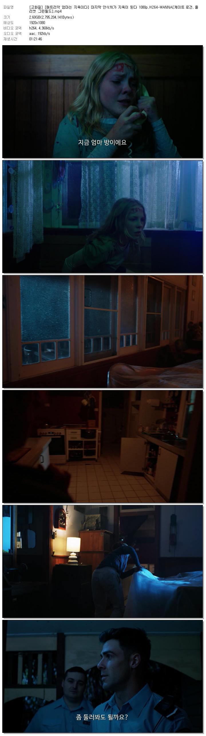 | [고화질] [매트리악 엄마는 지옥이다] 마지막 안식처가 지옥이 된다 1080p.H264-WANNA[케이트 로건, 줄리엣 그린필드].mp4 | 2.6 G | 01:21:46 | 1920x1080 |