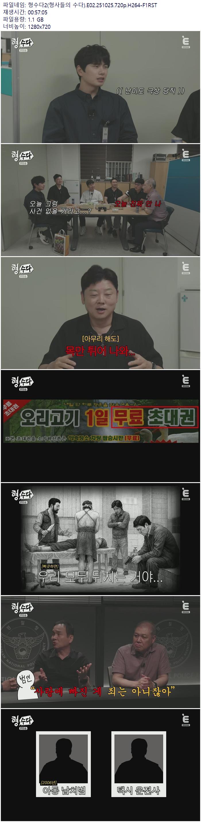 | 형수다2(형사들의 수다).E02.251025.720p.H264-F1RST.mp4 | 1.1 G | 00:57:05 | 1280x720 |