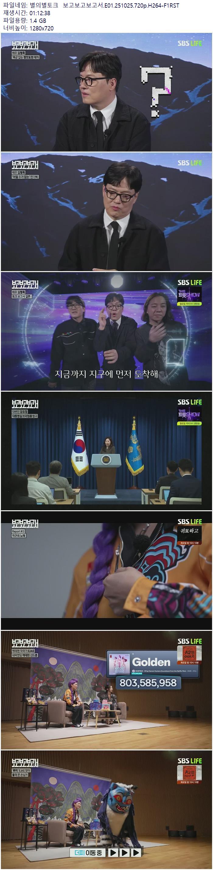 | 별의별토크 보고보고보고서.E01.251025.720p.H264-F1RST.mp4 | 1.4 G | 01:12:00 | 1280x720 |