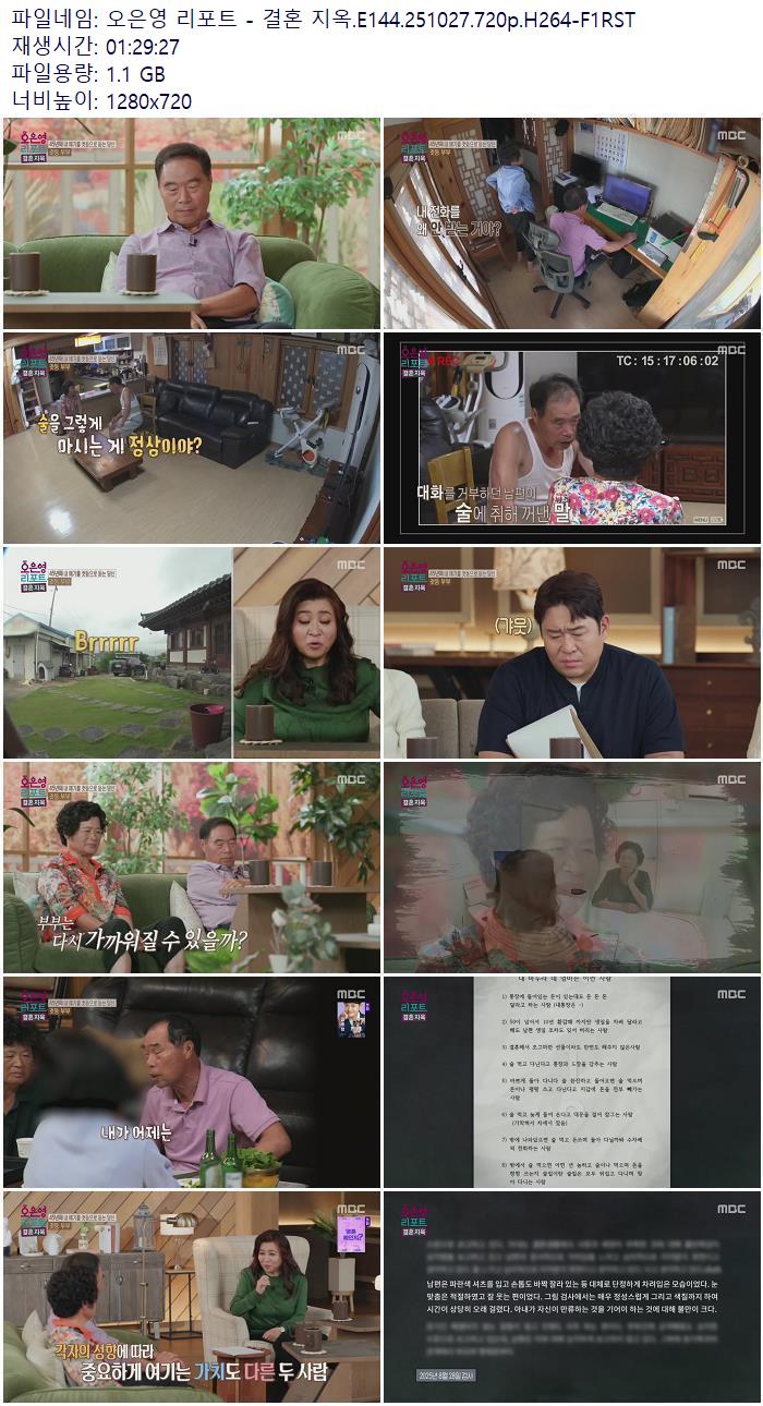| 오은영 리포트 - 결혼 지옥.E144.251027.720p.H264-F1RST.mp4 | 1.1 G | 01:29:00 | 1280x720 |