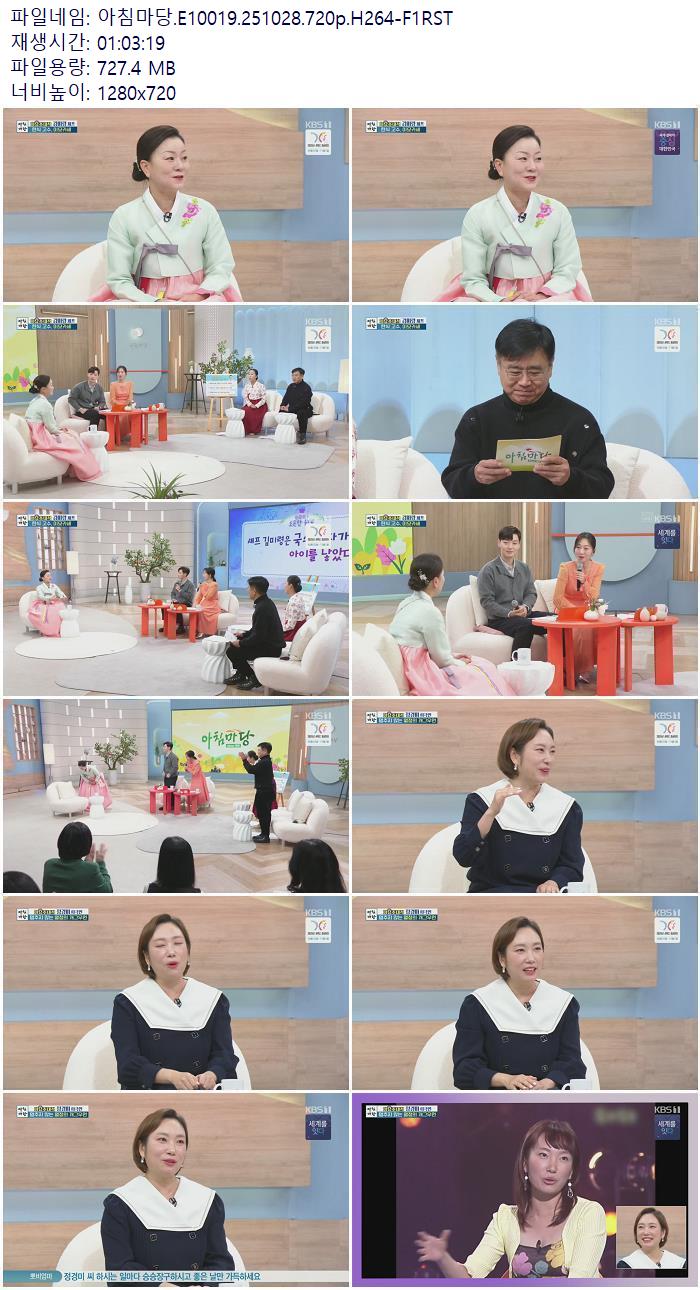 | 아침마당.E10019.251028.720p.H264-F1RST.mp4 | 727.4 M | 01:03:00 | 1280x720 |