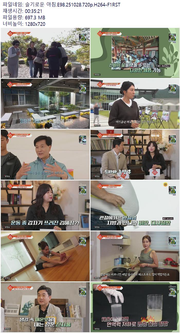 | 슬기로운 아침.E98.251028.720p.H264-F1RST.mp4 | 697.3 M | 00:35:21 | 1280x720 |