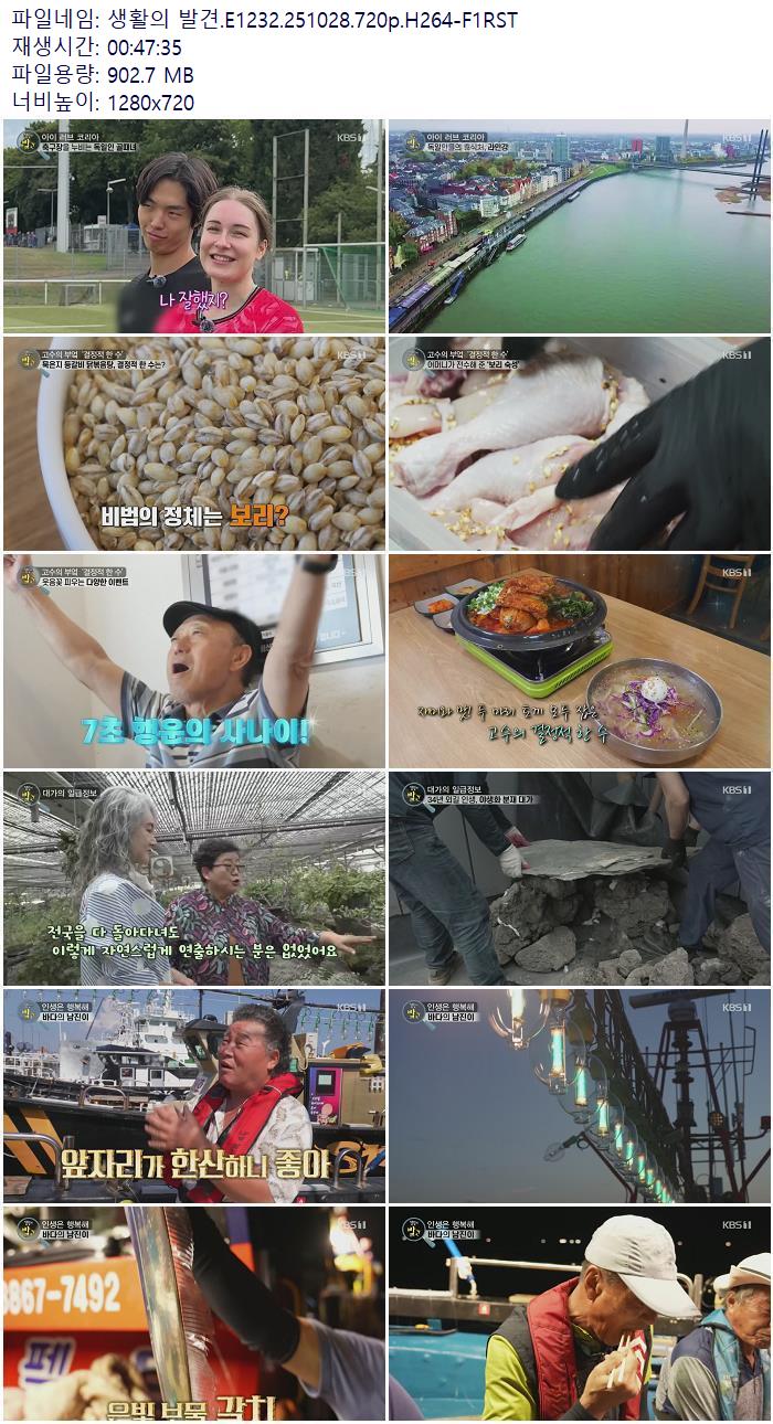| 생활의 발견.E1232.251028.720p.H264-F1RST.mp4 | 902.7 M | 00:47:35 | 1280x720 |