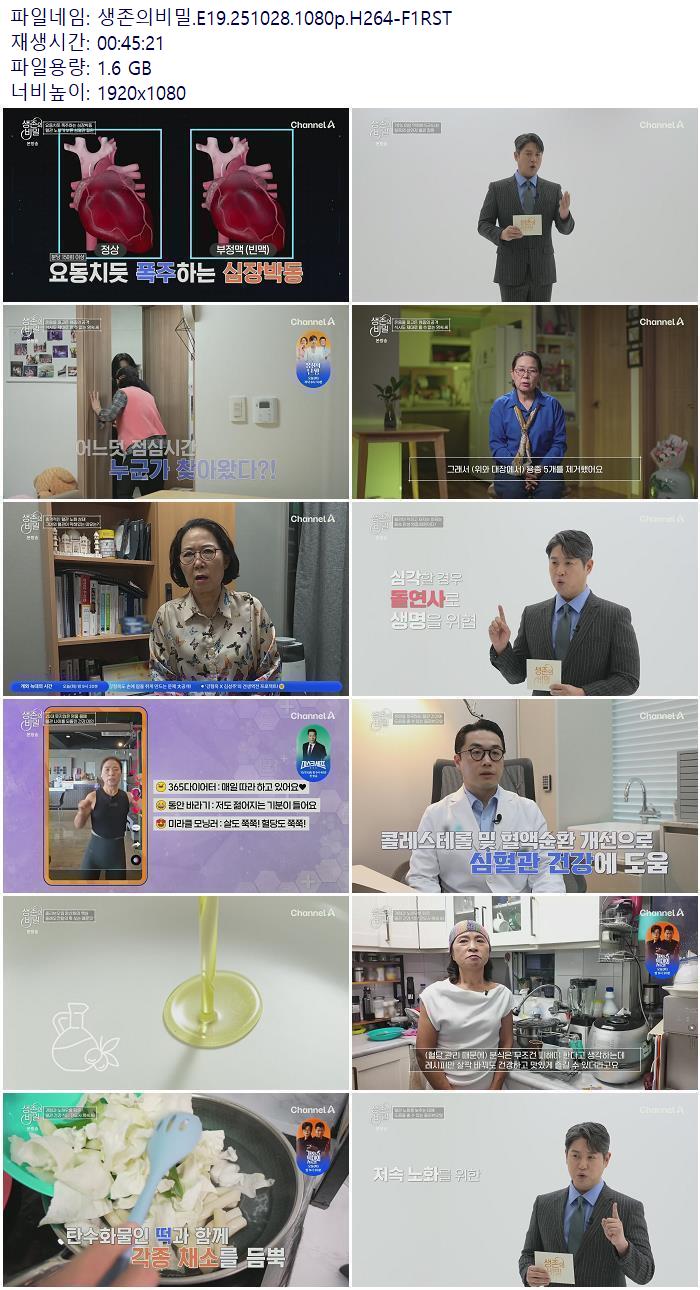 | 생존의비밀.E19.251028.1080p.H264-F1RST.mp4 | 1.6 G | 00:45:21 | 1920x1080 |