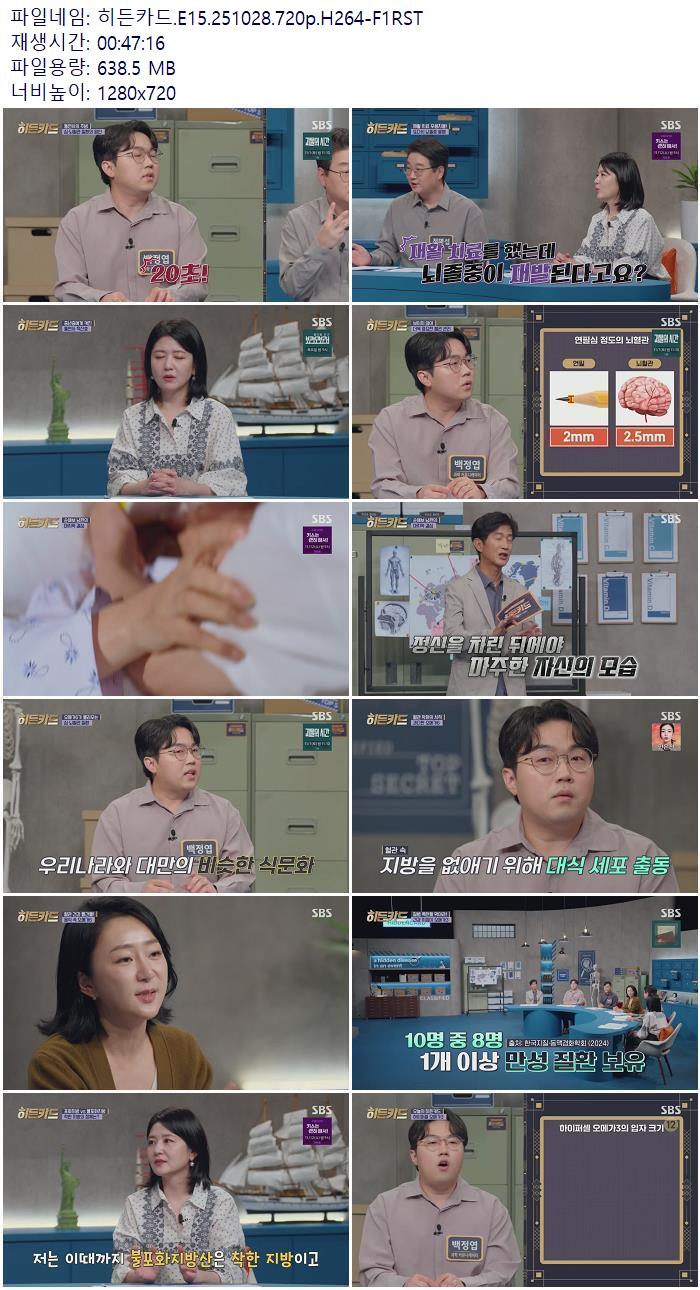 | 히든카드.E15.251028.720p.H264-F1RST.mp4 | 638.5 M | 00:47:16 | 1280x720 |