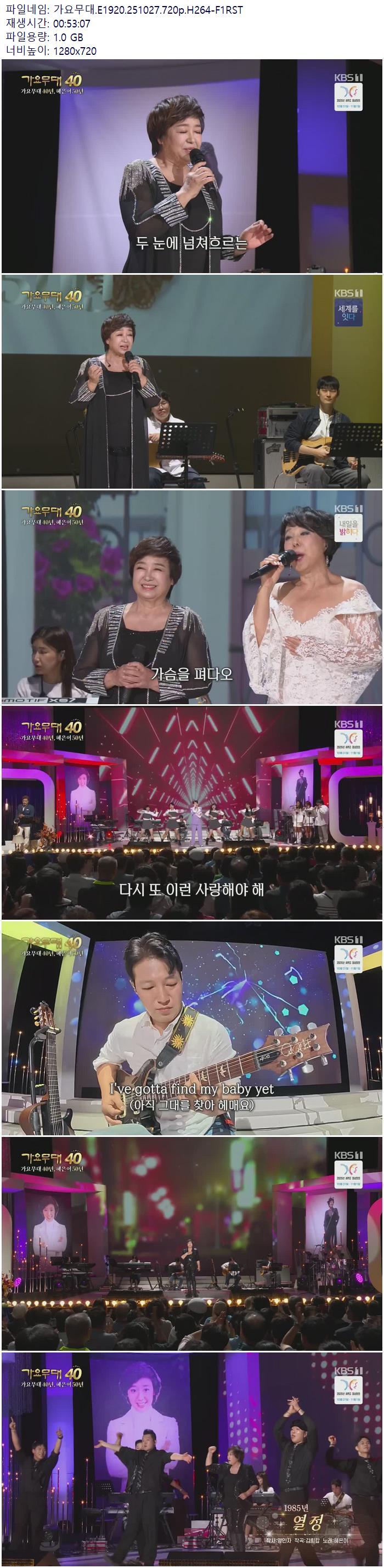 | 가요무대.E1920.251027.720p.H264-F1RST.mp4 | 1 G | 00:53:07 | 1280x720 |