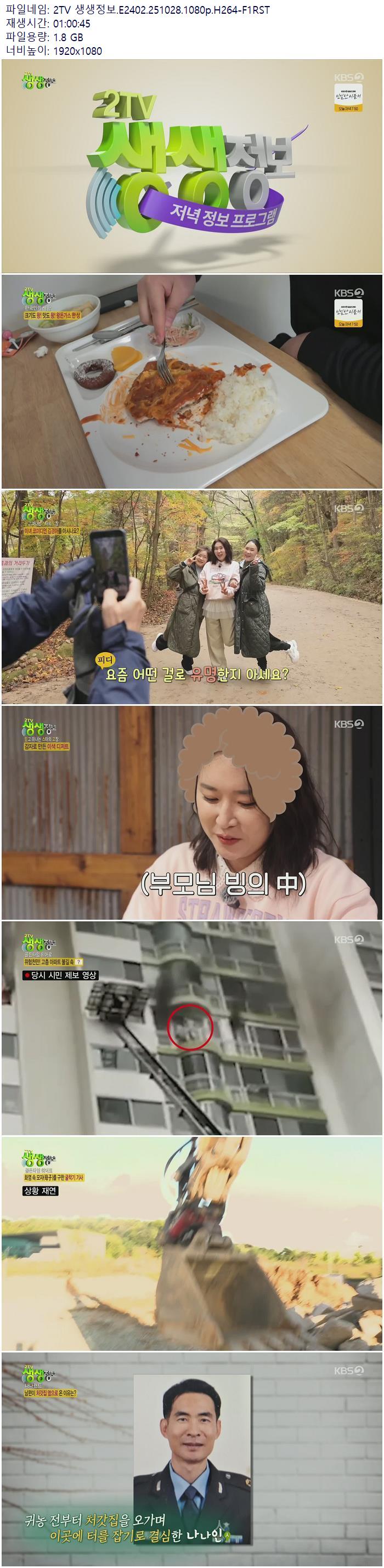 | 2TV 생생정보.E2402.251028.1080p.H264-F1RST.mp4 | 1.8 G | 01:00:00 | 1920x1080 |