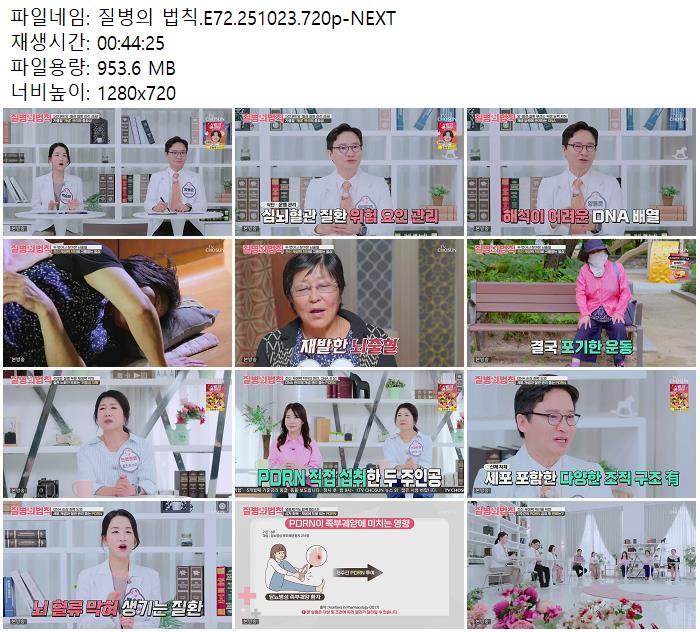 | 질병의 법칙.E72.251023.720p-NEXT.mp4 | 953.6 M | 00:44:25 | 1280x720 |